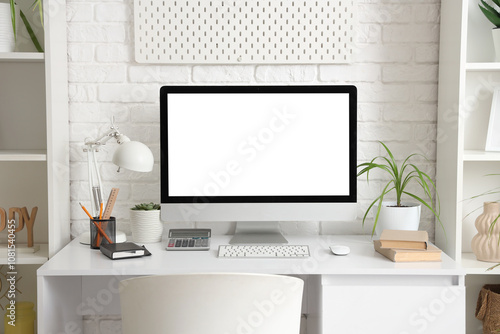 © Pixel-Shot, Obraz premium Workplace with computer monitor and plant in office