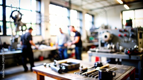Obraz premium Workshop Blur: Blurred workshop environment with tools and equipment.