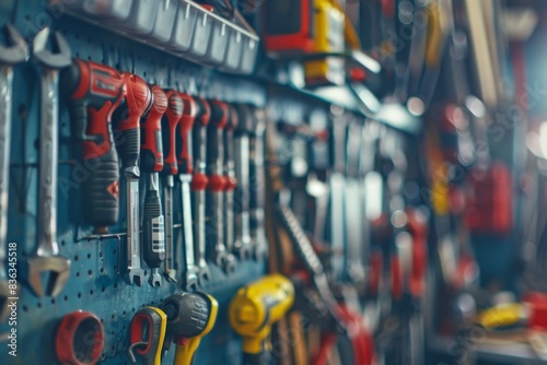 Fototapeta premium Workshop equipment garage master instruments tools tool craft craftsmanship repair service car mechanic business toolbox wrench repairing engineering hammeer manufacturing fix skill wall mount