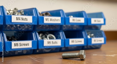 © Funni, Obraz premium Workshop organization concept with labeled blue bins for storing various hardware fasteners like bolts, nuts, and screws on a wooden bench