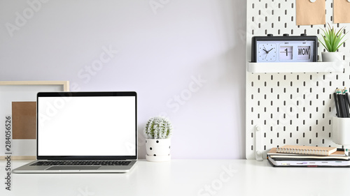 Obraz premium Workspace computer, Empty screen laptop and office supplies on white office desk.