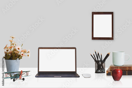© Songsak C, Obraz premium Workspace with modern desktop computer, office supplies flower plant at home or studio. Mock up.