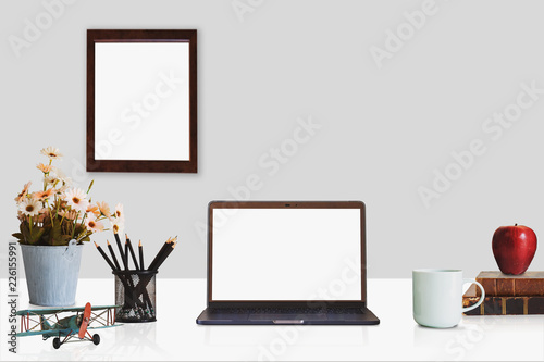 © Songsak C, Obraz premium Workspace with modern desktop computer, office supplies flower plant at home or studio. Mock up.