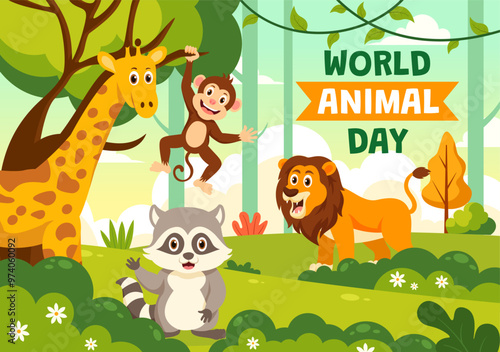 Fototapeta premium World Animal Day Vector Illustration with a Variety of Animals or Wildlife in the Natural Habitat to Forest Protection and Environmental Awareness