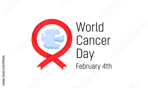 Fototapeta premium World Cancer day poster design with red ribbon, white pigeon and text.