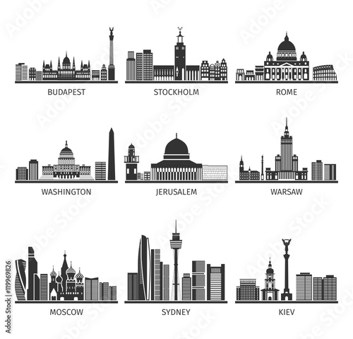 © Macrovector, Naklejka premium World Famous Cityscapes Black Icons Set