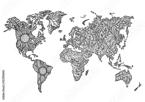 © Benjavisa Ruangvaree, Obraz premium world map hand drawn flower floral design vector