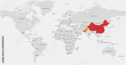 © habib billah, Obraz premium World Map Highlighting china and pakistan in Color