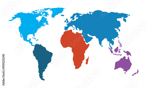 Fototapeta premium World Map Highlighting Continents with Distinct Colors