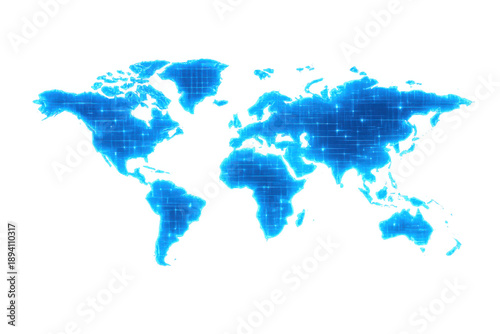 Fototapeta premium World map in blue digital grid showing global network, connectivity, data transfer, and technology concept on transparent background