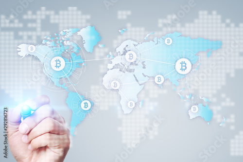 © WrightStudio, Fototapeta premium World map with bitcoin icons on virtual screen. Crypto currency. Blockchain technology. Internet payments.