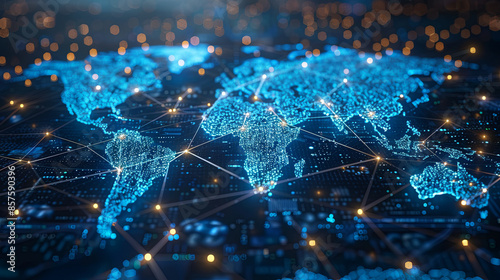 Fototapeta premium World Map with Glowing Digital Connections Between Countries and Cities,...