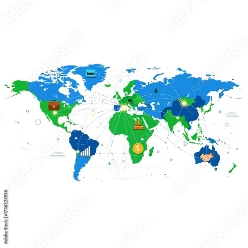 Obraz premium World Map with Icons Representing Different Continents and Countries.