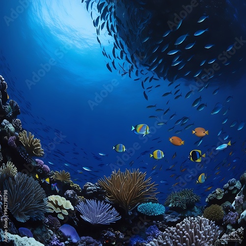 © Rashidul, Naklejka premium World Oceans day banner. World Ocean day wallpaper with blue ocean, fish and lettering. Ai generated