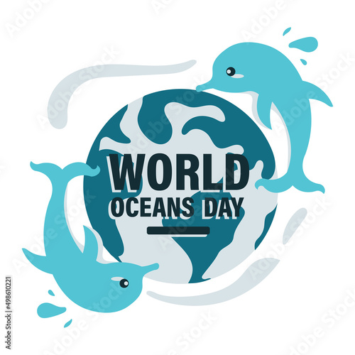 Fototapeta premium World Oceans Day underwater save marine life earth blue dolphin poster vector design picture image