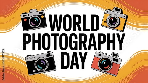 Obraz premium World Photography Day graphic with bold lettering and camera illustrations