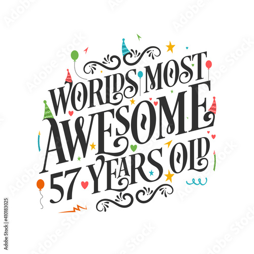 Fototapeta premium World's most awesome 57 years old - 57 Birthday celebration with beautiful calligraphic lettering design.