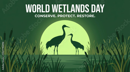 Obraz premium World wetlands day features two crane silhouettes standing in a grassy area...