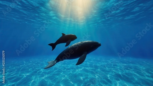 © Panisara, Obraz premium World Whale Day concept, Two dolphins gracefully swimming underwater in a serene ocean environment. 3D render
