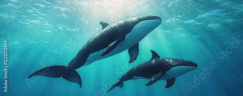 © Watcharaphon, Fototapeta premium World whale day with marine and habitat idea. Two whales swimming gracefully in clear blue water.