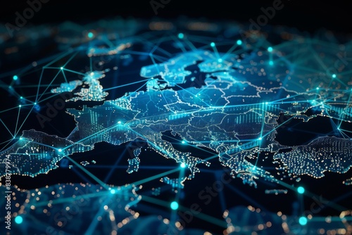 © Maxim Borbut, Obraz premium World Wide Web banner with nexus lines, grid, and nodes. Conceptual illustration of technological progress based on generative natural intelligence.