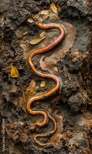© jambulart, Obraz premium Worm on wet ground with leaves.