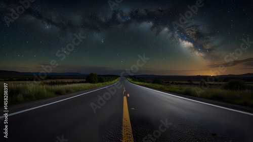 © Dalilah, Fototapeta premium Worm's-eye perspective of a road under a sky full of stars at night