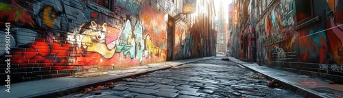 © Woranittha, Fototapeta premium Worms-eye view, a curious raccoon scavenging through colorful city graffiti, vibrant urban environment, keen exploration, dynamic lighting