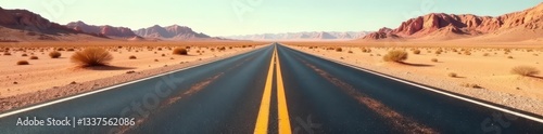 © Wasapol, Fototapeta premium Worn asphalt ribbon bisects barren desert expanse, shadows stretch long , desolate, barren