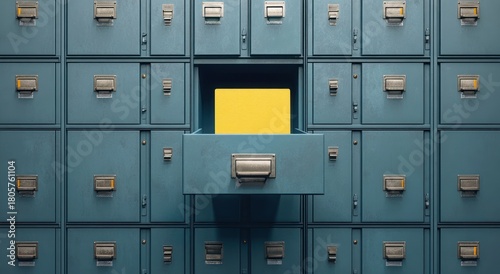 © Milana, Fototapeta premium Worn blue metal filing drawers filling the frame with one center drawer open revealing a bright yellow folder, evoking discovery and focus