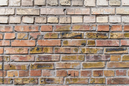 © Sergey, Naklejka premium Worn brick wall with yellow and red hues