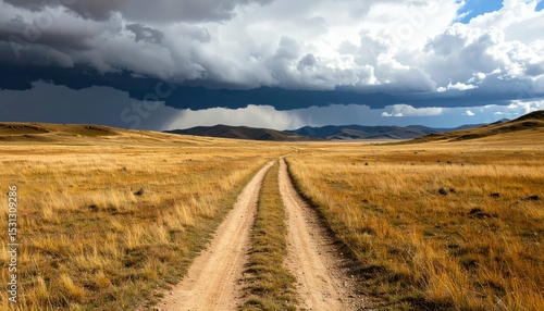© Kitta Studio, Fototapeta premium Worn Dirt Pathway Through Vast Empty Plains Under Dramatic Clouds
