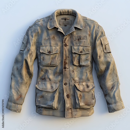 © Biplob, Naklejka premium Worn military jacket with several pockets and a detailed aged texture on a pristine white background high resolution photo