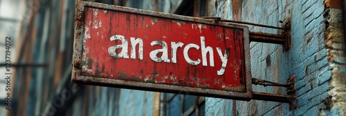© aicandy, Obraz premium Worn Red Anarchy Sign Mounted on Aged Urban Building Facade in A City Street, Illustrating Urban Culture and Rebellion Themes