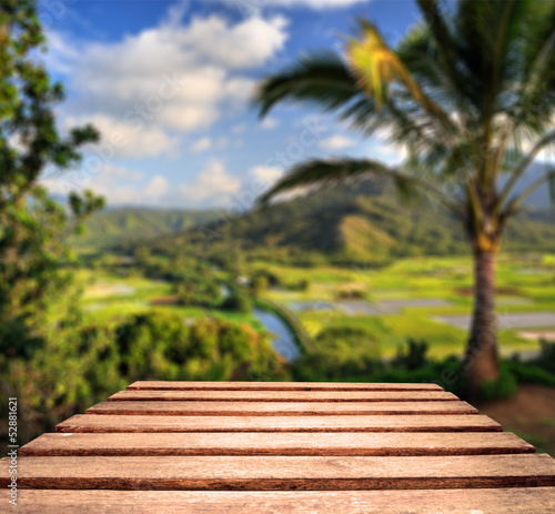 © Sarah Fields, Fototapeta premium Worn Table Top with tropical background