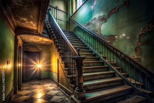 © Introvertia, Obraz premium Worn wooden staircase in abandoned mansion with sunlight