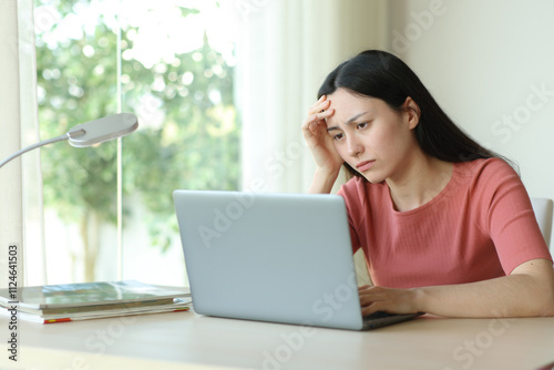 Fototapeta premium Worried asian woman checking bad news on laptop