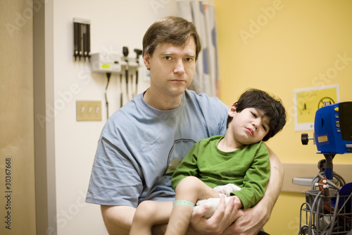 © Jaren Wicklund, Obraz premium Worried father holding his sick disabled son in doctor's office