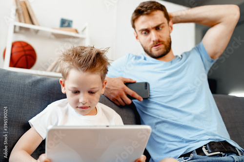 Fototapeta premium Worried father peeking at what his son is watching on digital tablet