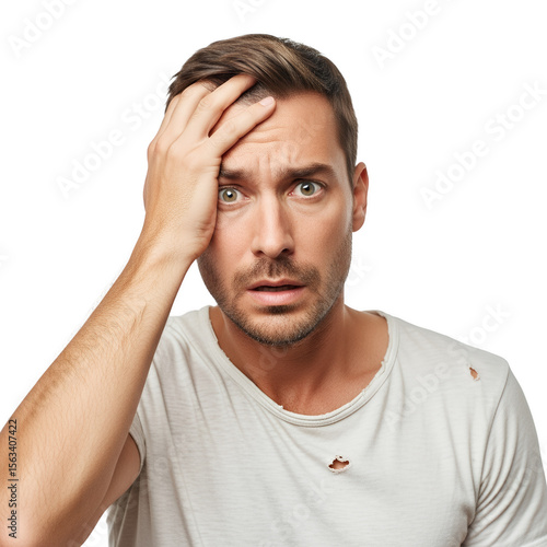 © Designer, Naklejka premium Worried man with hand on head expresses concern against black backdrop