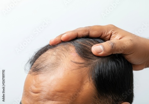 © Rohit k , Fototapeta premium Worried south asian male examining receding hairline and signs of balding, touching scalp with concerned expression against white backdrop
