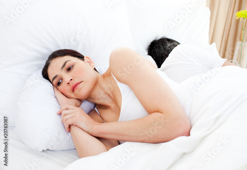 Fototapeta premium Worried woman lying in her bed