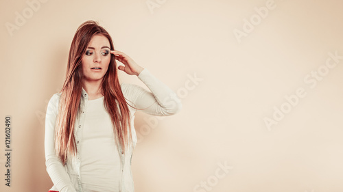 Fototapeta premium Worried woman with hand on head