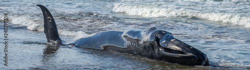 Fototapeta premium Wounded dying humpback whale grounding in the coast in Basque Country 32:9