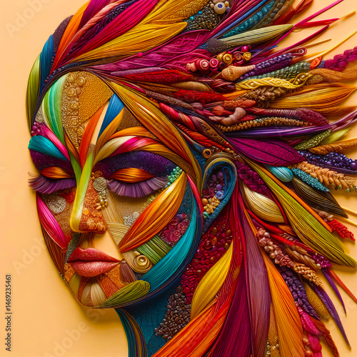 Naklejka premium Woven Ribbons & Threads Textured Portrait - Vibrant Textile Face Art