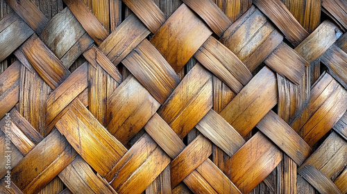© Yoonnam, Obraz premium woven wood wall showcasing intricate patterns symbolizing order in chaos. The interlocking designs highlight balance, craftsmanship, and the interplay between nature and human ingenuity