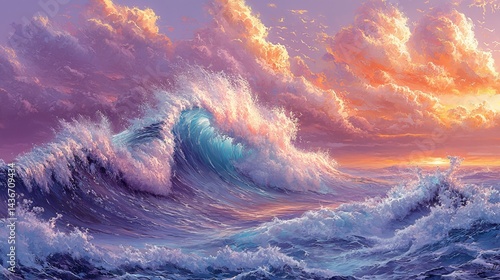 © LuDo, Fototapeta premium Wraithlike Tide is an illustration of a gently arcing, swirling tide of pastel fuscia, banded with lilac, set against the backdrop of a dark and shadowy stage