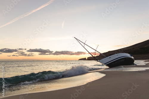 Naklejka premium Wrak statku na plaży na Majorce w Hiszpanii