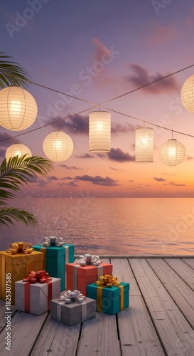 Fototapeta premium Wrapped gift boxes on a wooden pier with glowing lanterns over an ocean sunset, perfect for Christmas or New Year celebration