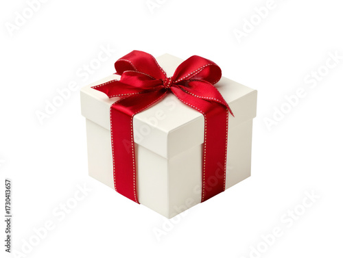© pantila, Obraz premium Wrapped in Elegance: White Gift Box with a Festive Red Ribbon and Bow on Black